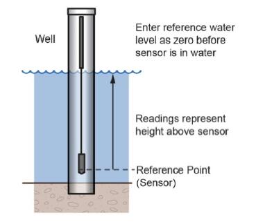 如果使用傳感器作為參考點,如下所示,在HOBOmobile中輸入參考水位為零,并在傳感器處于水中之前啟動記錄儀。 記錄的水位讀數將代表傳感器上方的高度。