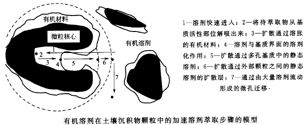 在加速溶劑萃取中,萃取參數對萃取過程的影響是基于被分析物從基質傳輸到溶劑的幾個步驟。下圖顯示了有機溶劑在土壤沉積物顆粒中的加速溶劑萃取步驟。這些步驟有助于討論為什么在提高的溫度和壓力下萃取效果比較好。
