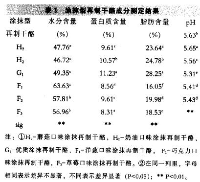 涂抹型再制干酪的水分含量、蛋白質含量、脂肪含量、pH 結果見表1。
