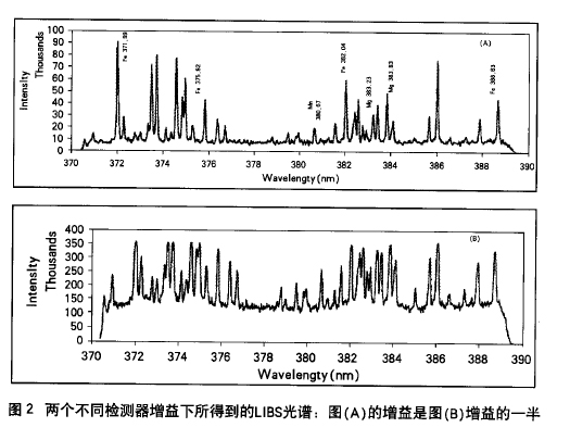 在最初的實驗中,ICCD的增益值設得很高,導致S/B差。將檢測器增益降低一半,可以得到較高S/B的UBS光譜圖。圖2表明了檢測器在兩種不同的增益下所記錄的LIBS光譜圖。在圖2(B)中設定的增益是圖2(A)的兩倍,從圖中可以看出圖2(B)的S/B低,因為使用較高的增益,強的分析信號被飽和,產生較差的S/B。設置較低的增益,能夠在較短的延遲時間內把LIBS信號記錄下來,但依[日有好的S/B。因而在目前的實驗裝置中,檢測增益值的設置也是一個重要的參數。