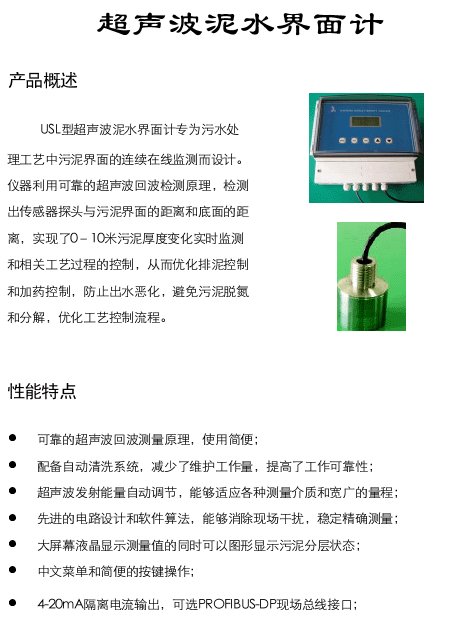 JKUSL系列超聲波泥水界面計(jì)專為污水處理工藝中污泥界面的連續(xù)監(jiān)測而設(shè)計(jì)。 儀器利用可靠的超聲波回波檢測原理,檢測出傳感器探頭與污泥界面的距離和底面的距離,實(shí)現(xiàn)了0-10米污泥厚度變化實(shí)時(shí)監(jiān)測和相關(guān)工藝過程的控制,從而優(yōu)化排泥控制和加藥控制,防止出水惡化,避免污泥脫氮和分解,優(yōu)化工藝控制流程。 |