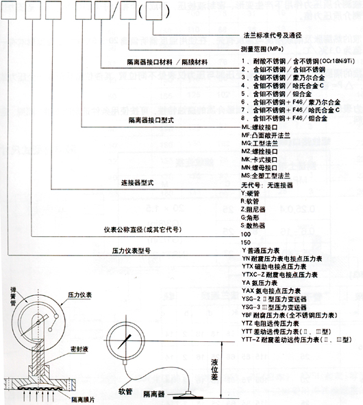 不得拆卸或更換已配置的儀表以免填充液外泄影響性能。訂貨請說明配置儀表名稱、型號、測量上限、精確度及連接管型式、軟管長、隔離器接口型式、隔離器接口材料,以及法蘭配接管子通徑、標(biāo)準(zhǔn)代號等。如要求配置其它型式儀表,請另行詳細說明。