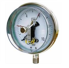 電接點(diǎn)壓力表適用測(cè)量對(duì)銅和銅合金無(wú)腐蝕性的氣體、液體或蒸汽等壓力。儀表設(shè)上下限二位開(kāi)關(guān)型接點(diǎn)裝置,在壓力達(dá)到設(shè)定值時(shí)發(fā)出信號(hào)或通斷控制電路,供作業(yè)系統(tǒng)自動(dòng)控制或發(fā)訊用。其抗振結(jié)構(gòu)可有效抑制指針的抖動(dòng)、沖擊、保護(hù)接點(diǎn),使儀表指示清晰電信號(hào)切換可靠,工作穩(wěn)定。電接點(diǎn)壓力表特性廣泛應(yīng)用于機(jī)械,化工、石油 冶金、電力等工業(yè)生產(chǎn)過(guò)程或機(jī)電配套中測(cè)量無(wú)爆炸危險(xiǎn)的各種流體介質(zhì)的壓力。通常,儀表經(jīng)與相應(yīng)的電氣器件(如繼電器及接觸器等)配套使用,即可對(duì)被測(cè)(控)壓力系統(tǒng)實(shí)現(xiàn)自動(dòng)控制和發(fā)信(報(bào)警)的目的。