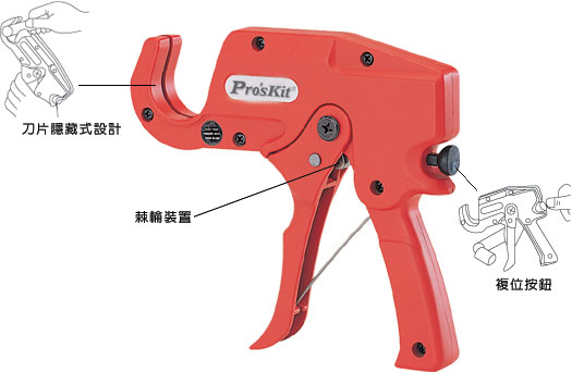 8PK-SR010, 省力型PVC切管鉗(6mm~35mm) [電工剪鉗類]. 全長: 190mm. 隱藏式刀片設計, 確保使用者安全. 內建式棘輪裝置, 操作輕松、省力. 剪切范圍: 外徑6mm ~ 35mm