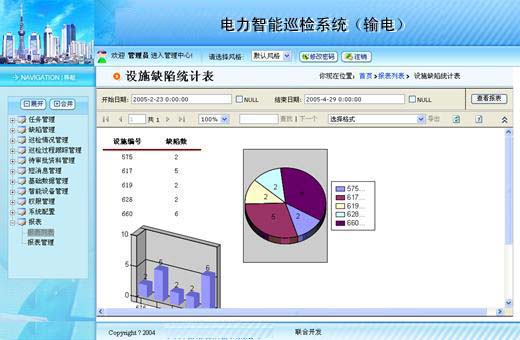 后臺管理系統能夠對歷史巡檢情況、缺陷記錄生成統計、分析查詢等報表。首先,可以直接在列表中查看所有的巡檢工作記錄;其次,系統同時提供多種報表、圖表對巡檢情況記錄進行功能強大的查看顯示。