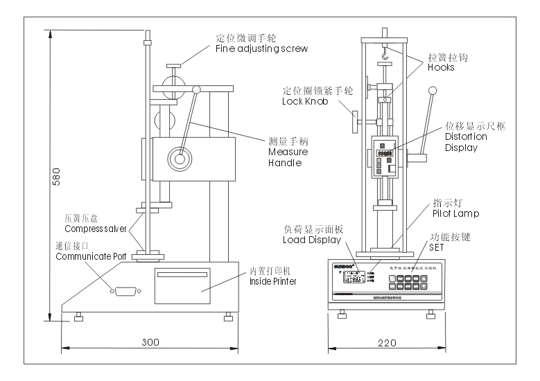 SD-200電子數(shù)顯彈簧拉壓試驗(yàn)機(jī)是測(cè)試?yán)臁?壓縮彈簧的變形量和負(fù)荷關(guān)系特性的專用儀器。適用拉伸、壓縮彈簧在一定工作長(zhǎng)度下的工作負(fù)荷的測(cè)試,也可用于橡膠、簧片等彈性器件的彈力負(fù)荷測(cè)試。具有高精度高分辨率;測(cè)試方向顯示;藍(lán)色背光燈顯示;上下限偏差值設(shè)定判斷,紅綠指示燈及蜂嗚器自動(dòng)聲光報(bào)警設(shè)置;可存儲(chǔ)10組測(cè)試數(shù)據(jù),自動(dòng)計(jì)算存儲(chǔ)數(shù)據(jù)的平均值;三種單位N、kgf、lbf自動(dòng)互換;具有峰值保持功能、峰值自動(dòng)解除功能及解除時(shí)間自由設(shè)定;無(wú)操作自動(dòng)關(guān)機(jī)的省電設(shè)計(jì),關(guān)機(jī)時(shí)間自由設(shè)定;內(nèi)置打印機(jī),可打印10組存儲(chǔ)的測(cè)試數(shù)據(jù)和最大值、最小值、平均值、合格或不合格值判斷等優(yōu)點(diǎn)。