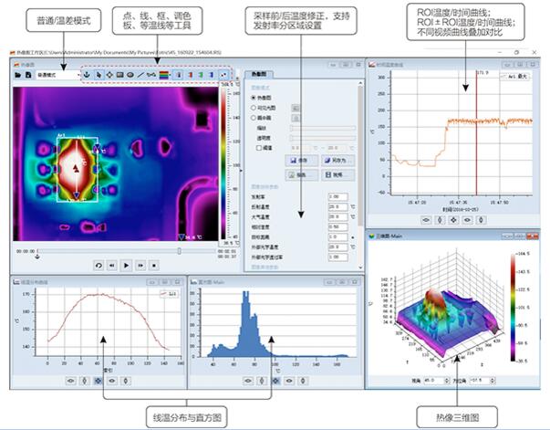 FOTRIC 220系列熱像儀配合PC端專業(yè)的AnalyzIR研發(fā)軟件記錄全輻射熱像視頻,視頻保存每一幀圖像每個像素點的溫度數(shù)據(jù)。