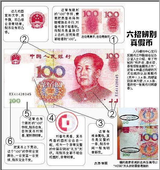 其中1、3、6,肉眼鑒別非常方便;2、4、5,最好和一張真錢對照著看。