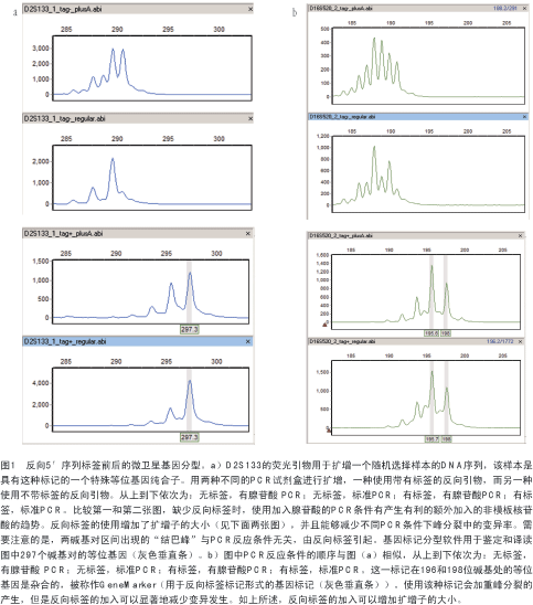 作者已經用特異添加腺苷酸的PCR和普通的標準PCR實驗證實了這種序列標簽的有效性。如圖1a和b所示,兩種不同雙核苷酸標記物的差異在于:當使用默認設計的引物時,其對所用PCR試劑盒的敏感性不同?墒牵绻谖礃擞浺镏屑尤5′標簽則可以減少兩種標記物的變異,從而減少每一種標記物出現問題的幾率。這提示我們:作為一種常規的防范手段,應當在所有常規的微衛星標記中加入這種標簽。