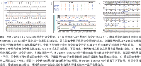 作者對用于序列變異檢測的突變檢測軟件(MutSurv,SoftGenetics公司,州立學院,巴拿馬)進行了評估。利用幾個含有已知單堿基改變、插入和缺失變異的樣本驗證了該軟件的有效性。該軟件對樣品標記進行排列和比較以提供參考或得到內在的一致序列標記和執行檢測運算法則,并通過質量得分、不同色譜圖和繪圖輸出等方式報告潛在突變/多態性。如果向其提供包括外顯子和內含子位點在內的開放閱讀框和已知變異,則可利用該軟件輸出和得到染色體組信息。