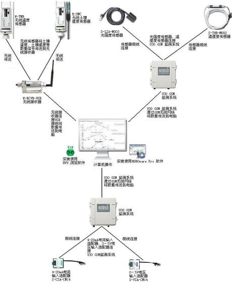 U30 GSM無線監(jiān)測系統(tǒng),通過連接4-20mA電流輸入適配器S-CIA-CM14和0-5V電壓輸入適配器
